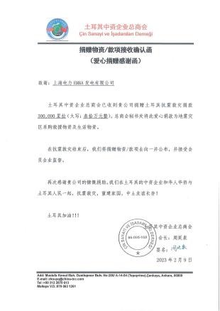 2.积极捐款捐物,支援救灾。电厂主动联系大使馆、当地政府,为中国国家救援队提供救援方木12立方米、医疗夹板100套和救援车辆,并向灾区捐款30万里拉、捐赠30万里拉救灾物资,获得中国应急管理部及土耳其能源部的充分肯定与感谢。