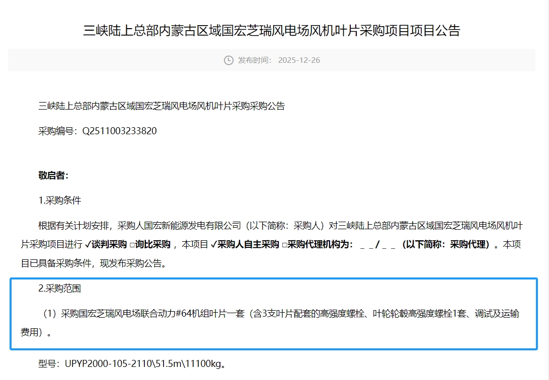 2025年12月26日,三峡发布《三峡陆上总部内蒙古区域国宏芝瑞风电场风机叶片采购项目项目公告》。