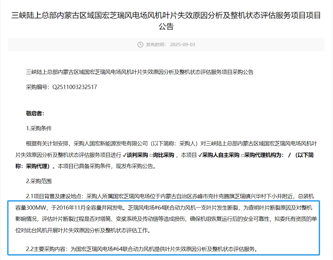 2025年9月3日,三峡能源发布《三峡陆上总部内蒙古区域国宏芝瑞风电场风机叶片失效原因分析及整机状态评估服务项目项目公告》。
