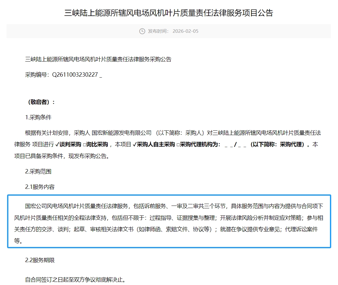 2026年2月5日,三峡发布《三峡陆上能源所辖风电场风机叶片质量责任法律服务项目公告》。