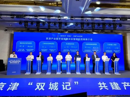 2023年京津产业握手链接洽谈会暨联合招商推介会,以“唱好京津‘双城记’共建产业生态圈”为主题,由北京市协同办、天津市协同办主办,由京津冀协同发展联合工作办公室、天津市合作交流办、天津市政府驻京办事处支持,由北京经济技术开发区管委会、天津市武清区政府承办,由北京市协同发展服务促进会、中关村社会组织联合会协办。活动旨在进一步深化京津产业协同发展,为京津企业搭建交流对接和联合招商平台,促进产业链延链、补链、强链、优链,提升区域产业链供应链能力和韧性水平,推动京津冀协同发展不断迈上新台阶。本次招商推介会,京津两市企业签约合作项目共41个,意向投资额约271.811亿元。