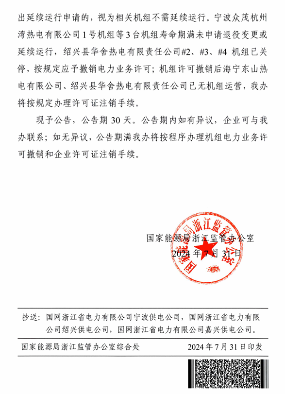 近日,国家能源局浙江能监办发布拟撤销许可寿命到期机组名单。宁波众茂杭州湾热电有限公司1号机组等3台机组寿命期满未申请退役变更或延续运行,绍兴县华舍热电有限责任公司#2、#3、#4机组已关停,按规定应予撤销电力业务许可;机组许可撤销后海宁东山热电有限公司、绍兴县华舍热电有限责任公司已无机组运营。详情如下:
