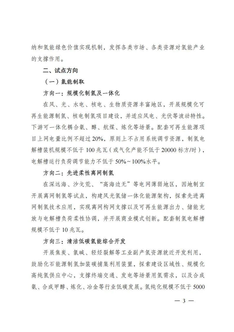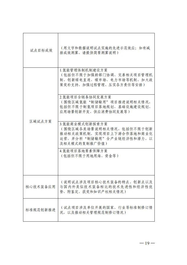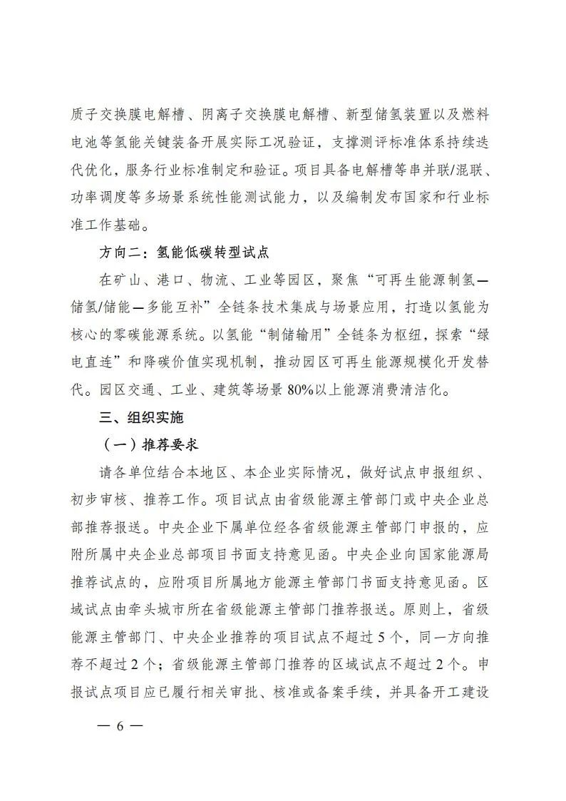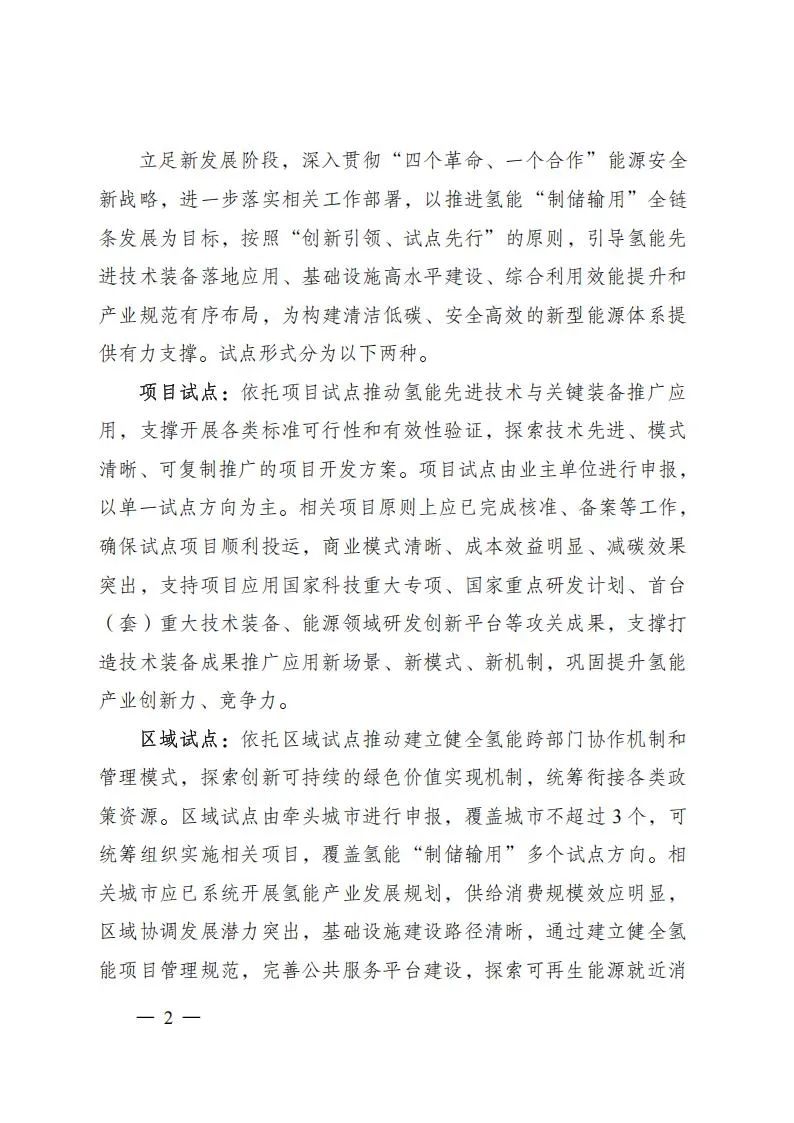 项目试点:依托项目试点推动氢能先进技术与关键装备推广应用,支撑开展各类标准可行性和有效性验证,探索技术先进、模式清晰、可复制推广的项目开发方案。项目试点由业主单位进行申报,以单一试点方向为主。相关项目原则上应已完成核准、备案等工作,确保试点项目顺利投运,商业模式清晰、成本效益明显、减碳效果突出,支持项目应用国家科技重大专项、国家重点研发计划、首台(套)重大技术装备、能源领域研发创新平台等攻关成果,支撑打造技术装备成果推广应用新场景、新模式、新机制,巩固提升氢能产业创新力、竞争力。