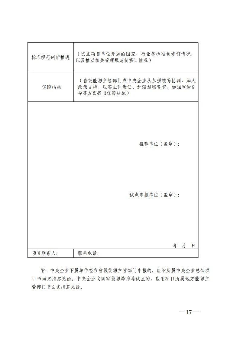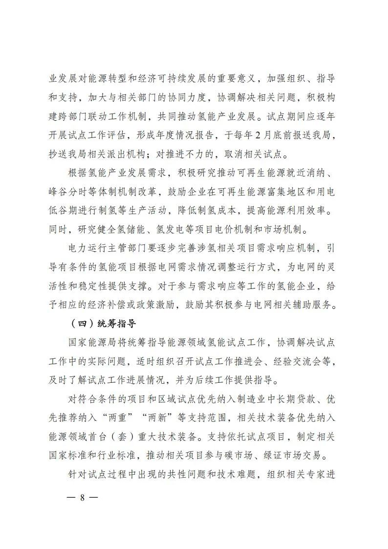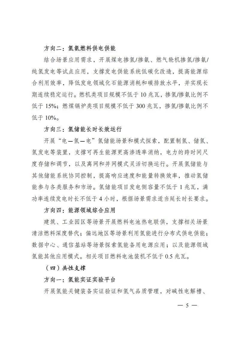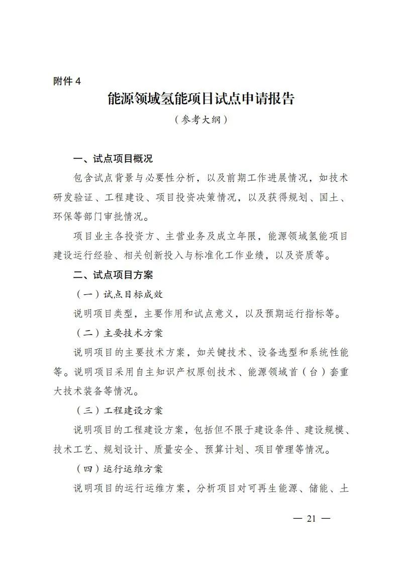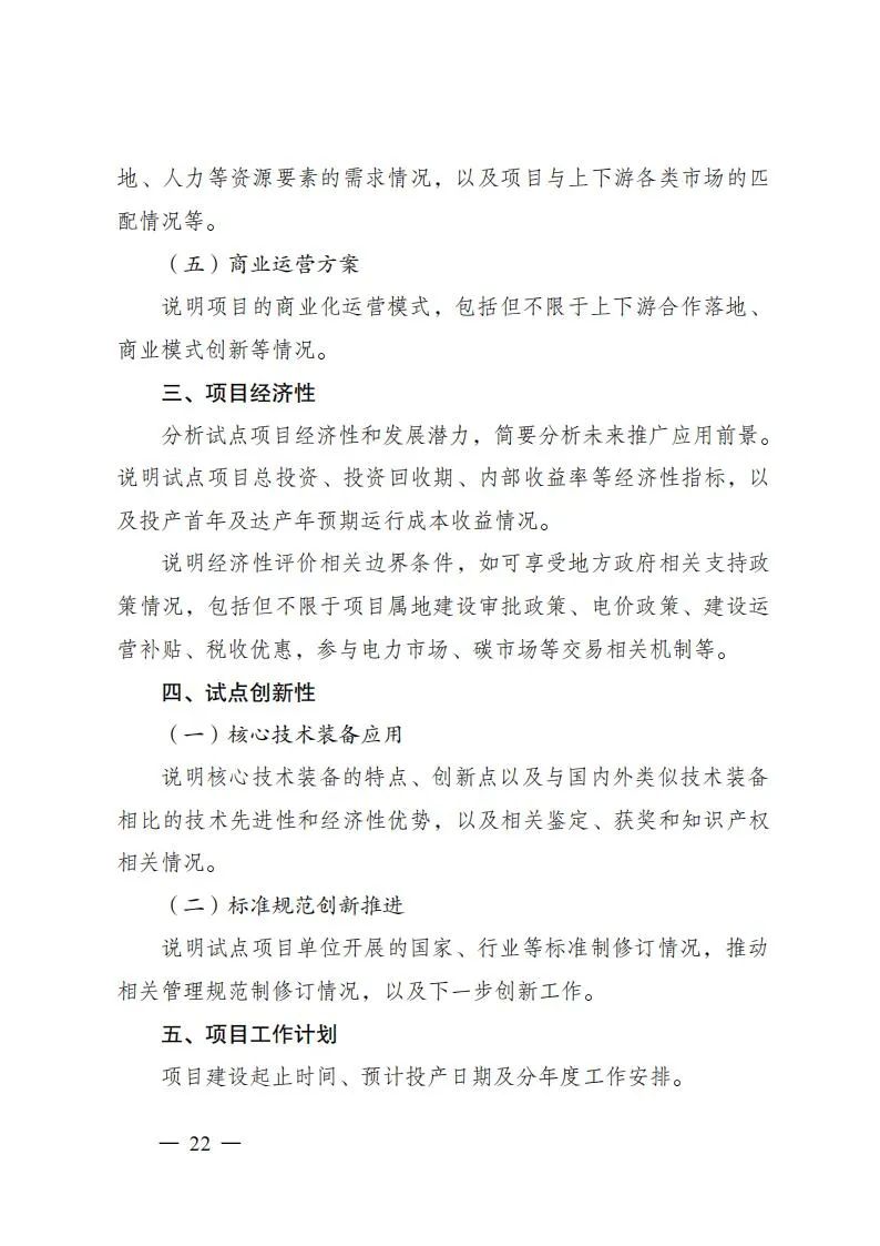 项目试点:依托项目试点推动氢能先进技术与关键装备推广应用,支撑开展各类标准可行性和有效性验证,探索技术先进、模式清晰、可复制推广的项目开发方案。项目试点由业主单位进行申报,以单一试点方向为主。相关项目原则上应已完成核准、备案等工作,确保试点项目顺利投运,商业模式清晰、成本效益明显、减碳效果突出,支持项目应用国家科技重大专项、国家重点研发计划、首台(套)重大技术装备、能源领域研发创新平台等攻关成果,支撑打造技术装备成果推广应用新场景、新模式、新机制,巩固提升氢能产业创新力、竞争力。