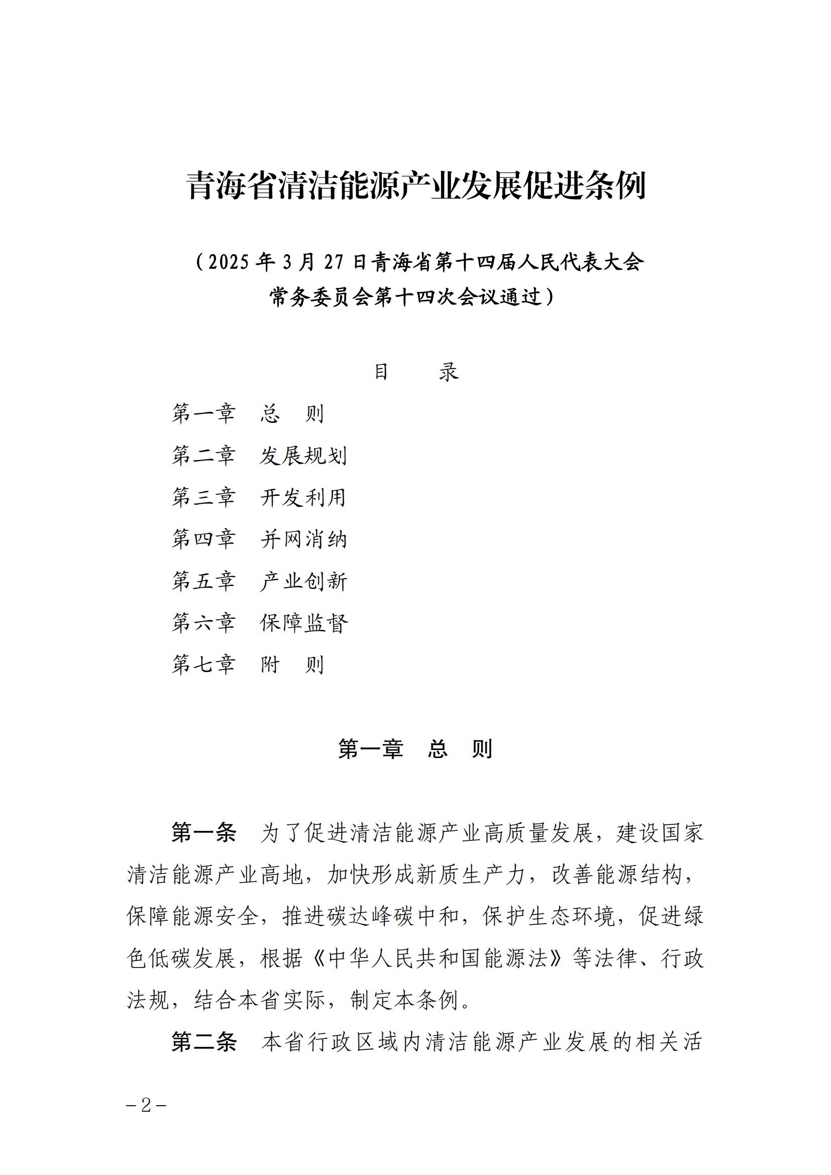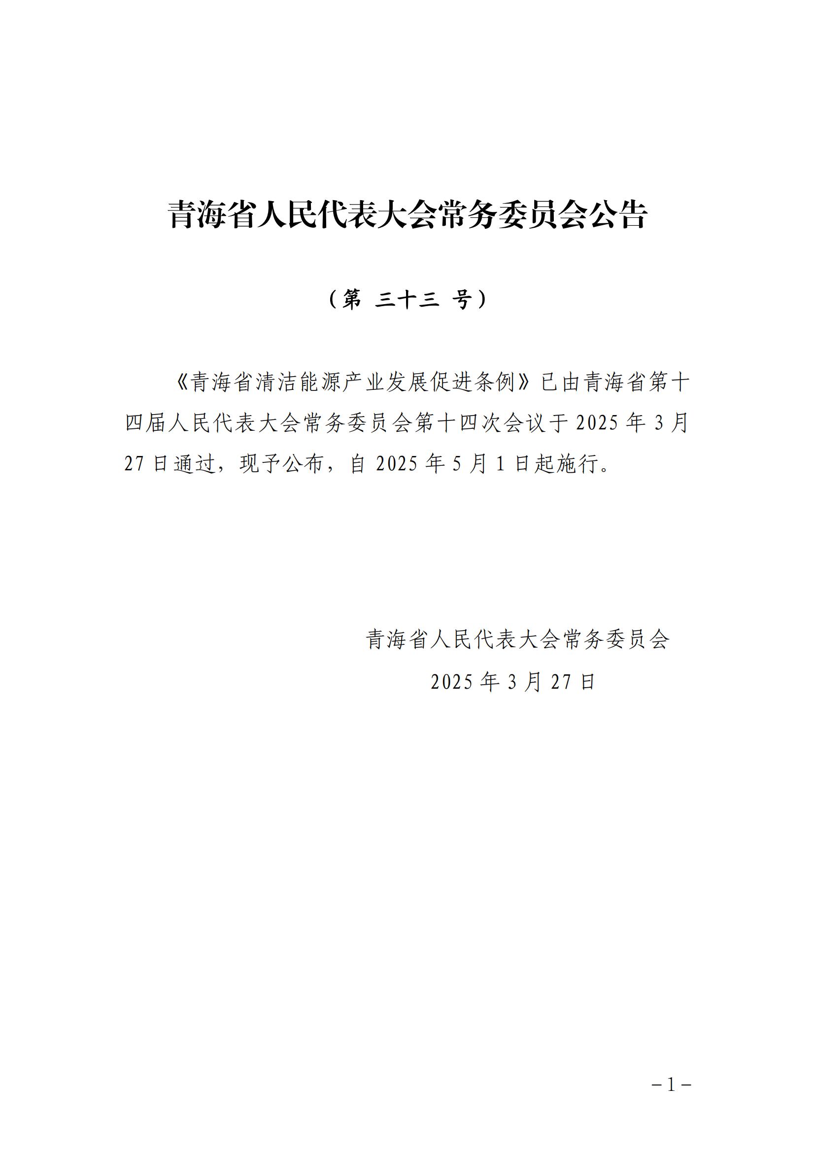 《青海省清洁能源产业发展促进条例》已由青海省第十四届人民代表大会常务委员会第十四次会议于2025年3月27日通过,现予公布,自2025年5月1日起施行。
