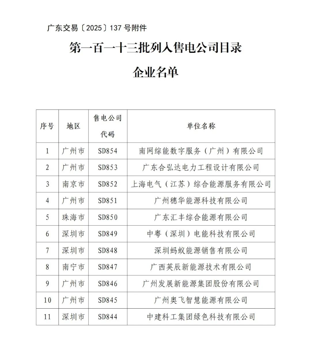 南网综能数字服务(广州)有限公司、广东合弘达电力工程设计有限公司、上海电气(江苏)综合能源服务有限公司、广州穗华能源科技有限公司、广东汇丰综合能源有限公司、中粤(深圳)电能科技有限公司、深圳蚂蚁能源销售有限公司、广西英辰新能源技术有限公司、广州发展新能源集团股份有限公司、广州奥飞智慧能源有限公司、中建科工集团绿色科技有限公司等11家公司未收到公示异议,列入售电公司目录,其在交易中心的注册登记自动生效。