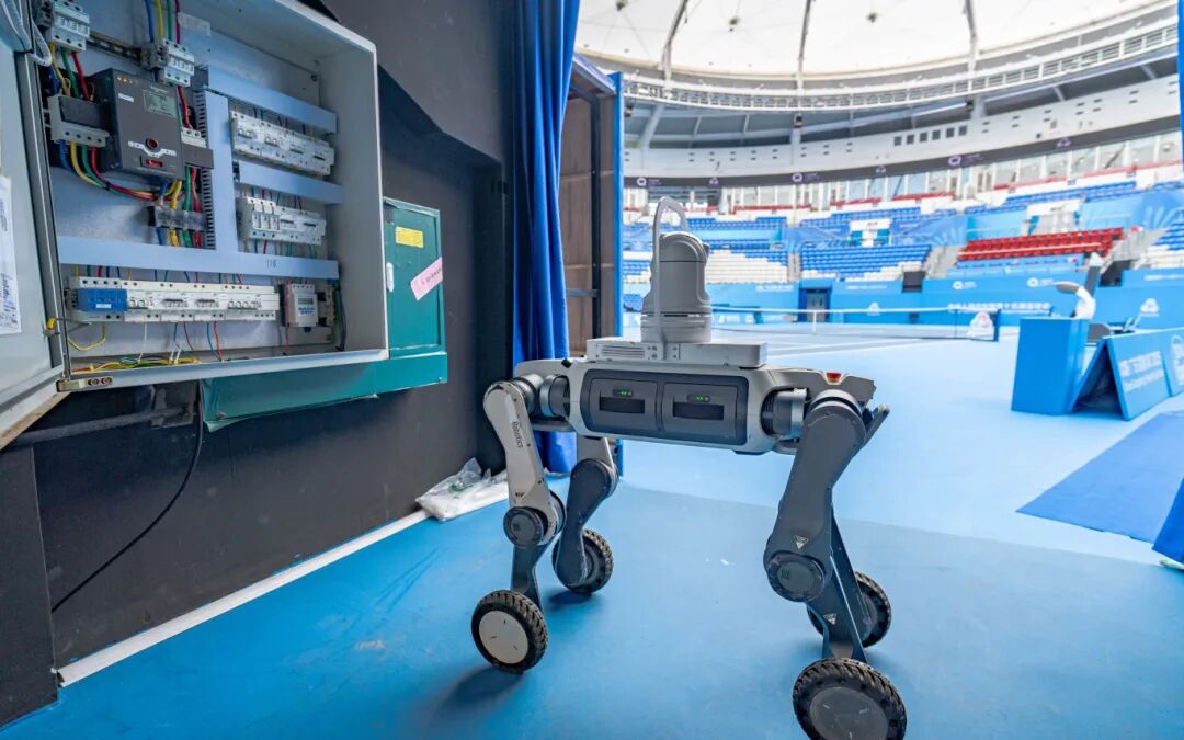 图:珠海横琴供电局利用轮式机器狗对网球赛场馆内部的重要负荷配电箱进行检查,以“智慧感知网络”保障赛事用电的稳定与安全