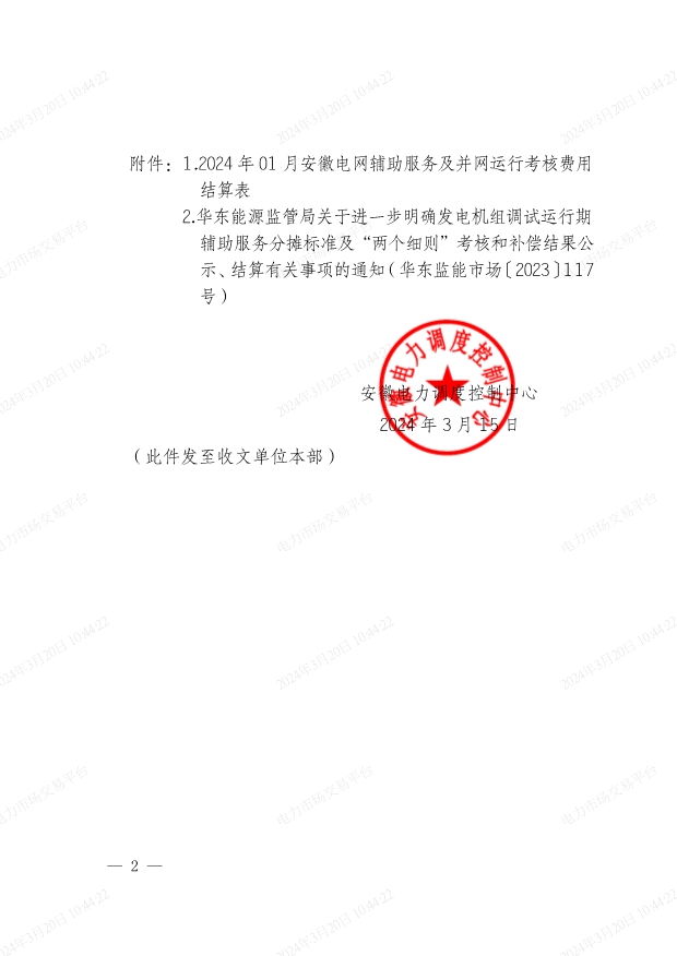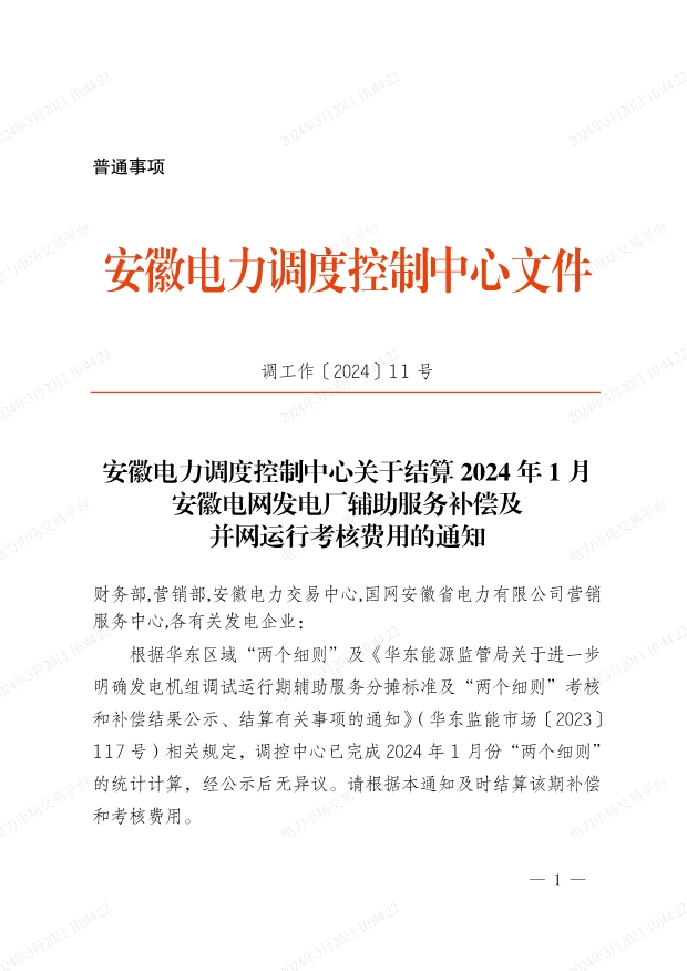 近日,安徽电力交易中心发布关于结算2024年1月安徽电网发电厂辅助服务补偿及并网运行考核费用的通知,详情如下: