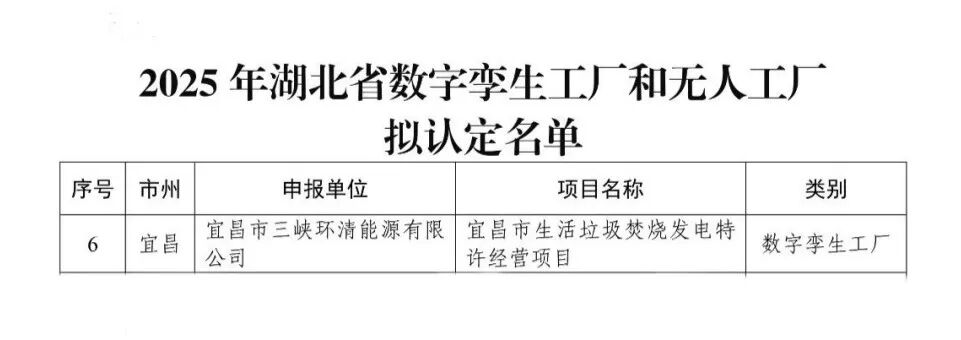 近日,湖北省经济和信息化厅正式公布了2025年湖北省数字孪生工厂和无人工厂认定名单,宜昌垃圾发电项目脱颖而出,被认定为“湖北省数字孪生工厂”,这一荣誉不仅是对项目自身数字化建设的肯定,更是公司践行“双碳”目标、助力湖北省制造业高端化、智能化、绿色化发展的又一重要成果。