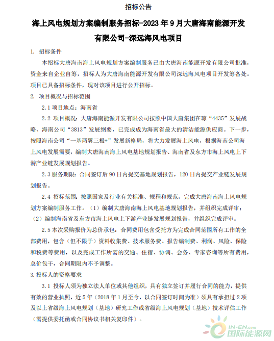 8月14日,大唐集团发布海上风电规划方案编制服务招标-2023年9月大唐海南能源开发有限公司-深远海风电项目招标公告。