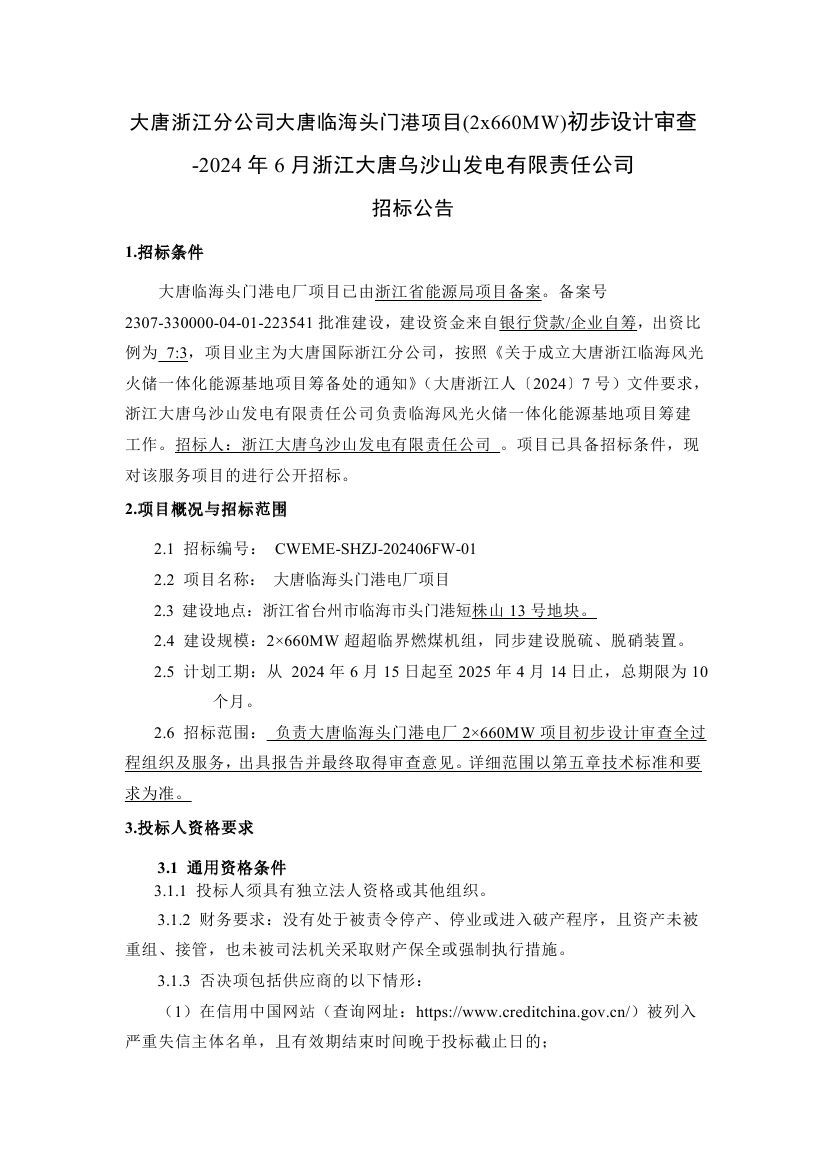 【大唐浙江分公司大唐临海头门港项目(2x660MW)初步设计审查-2024年6月浙江大唐乌沙山发电有限责任公司】招标公告