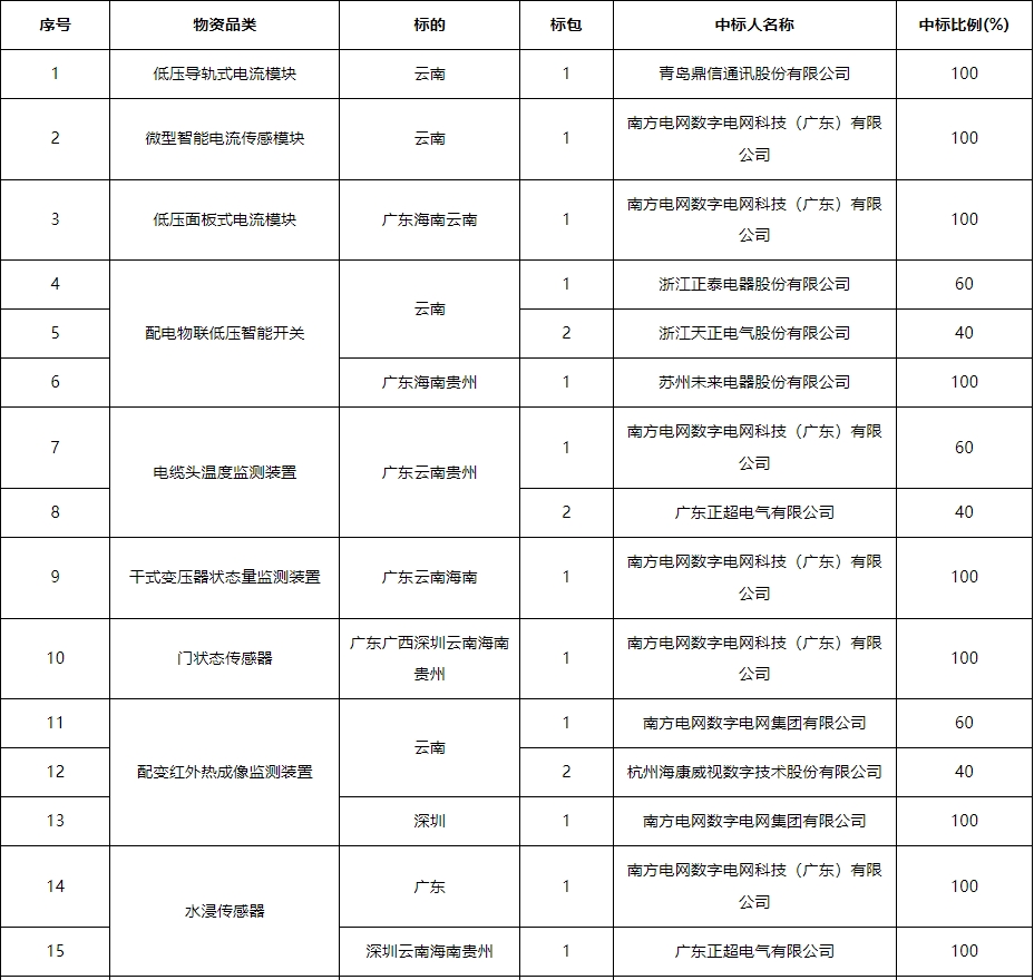 南方电网公司2024年数字变电站、数字输电和智能配电系列传感终端以及北斗终端第一批框架招标项目中标结果公告