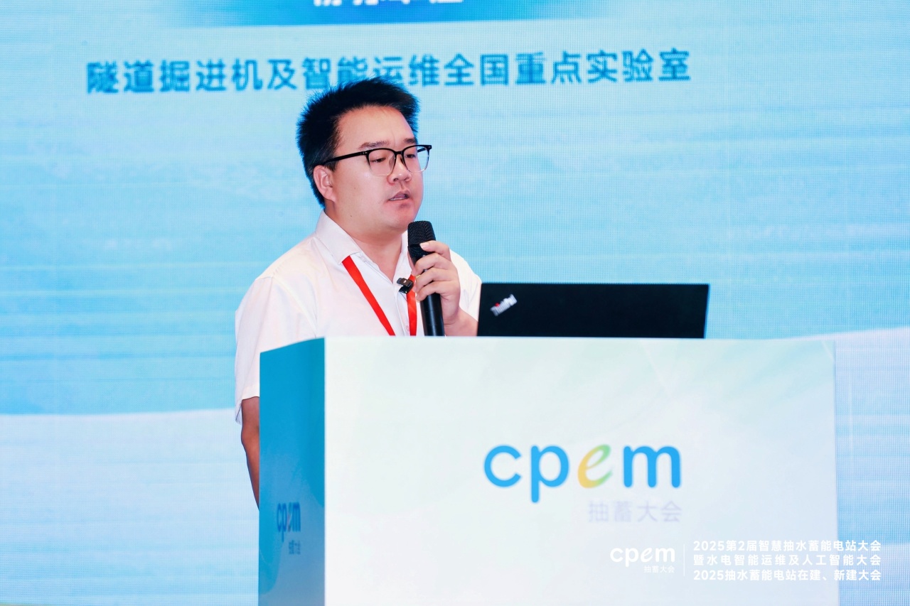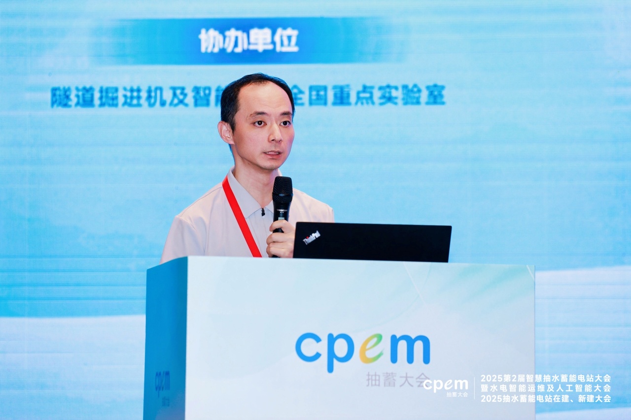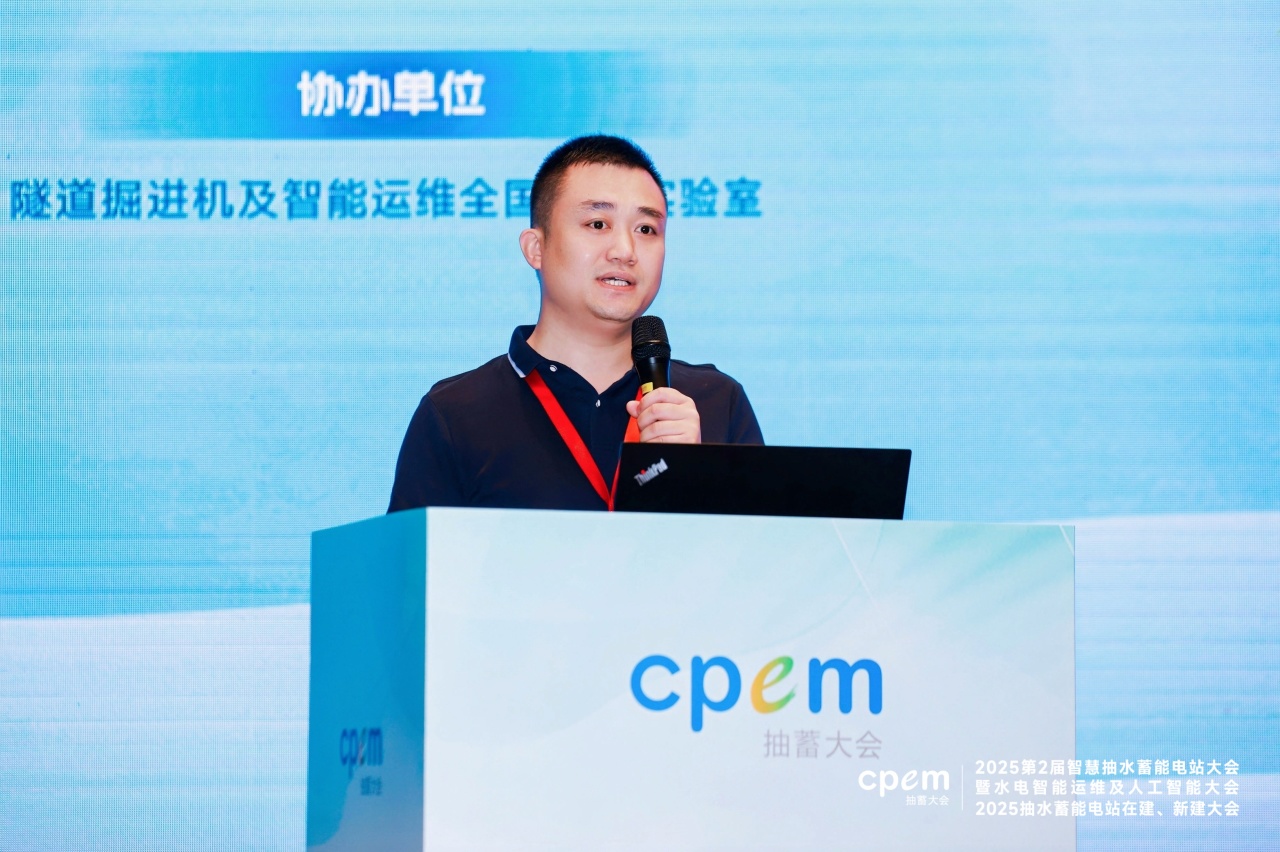 中国水利水电第六工程局有限公司科技与数字化部副主任汪云峰作《大型抽水蓄能电站上水库及引水系统智能建造关键技术研究与应用》主题分享。