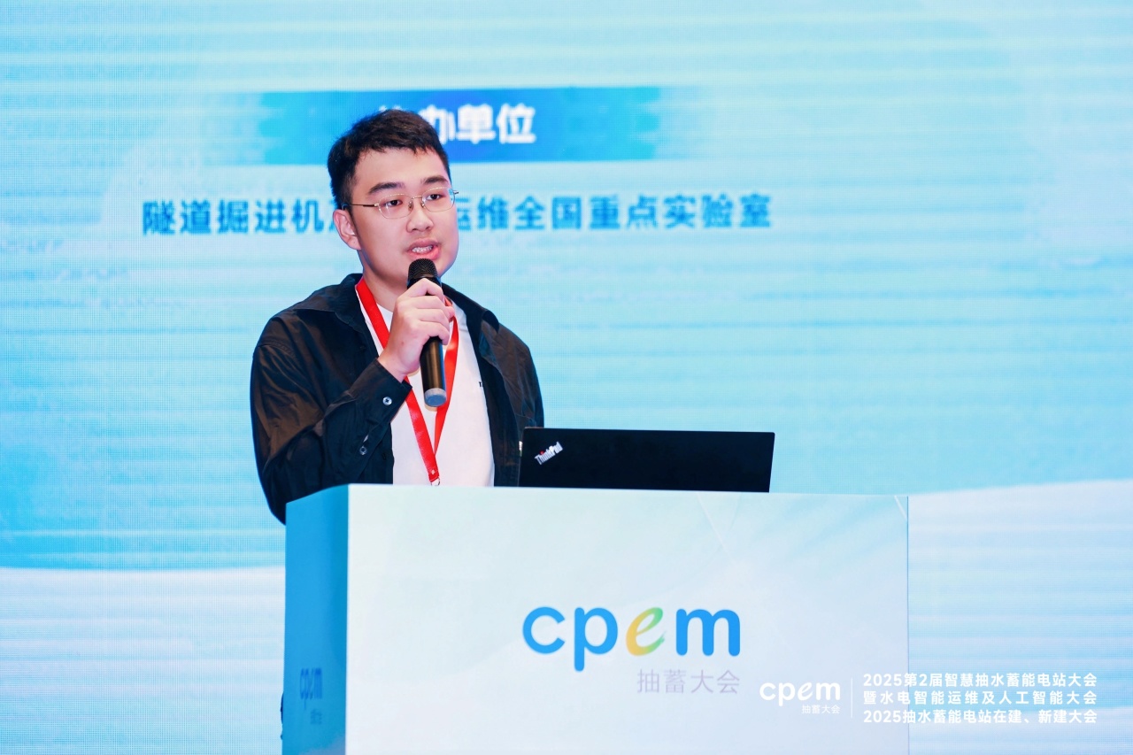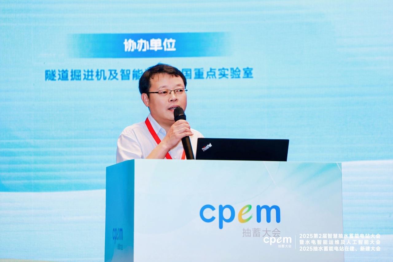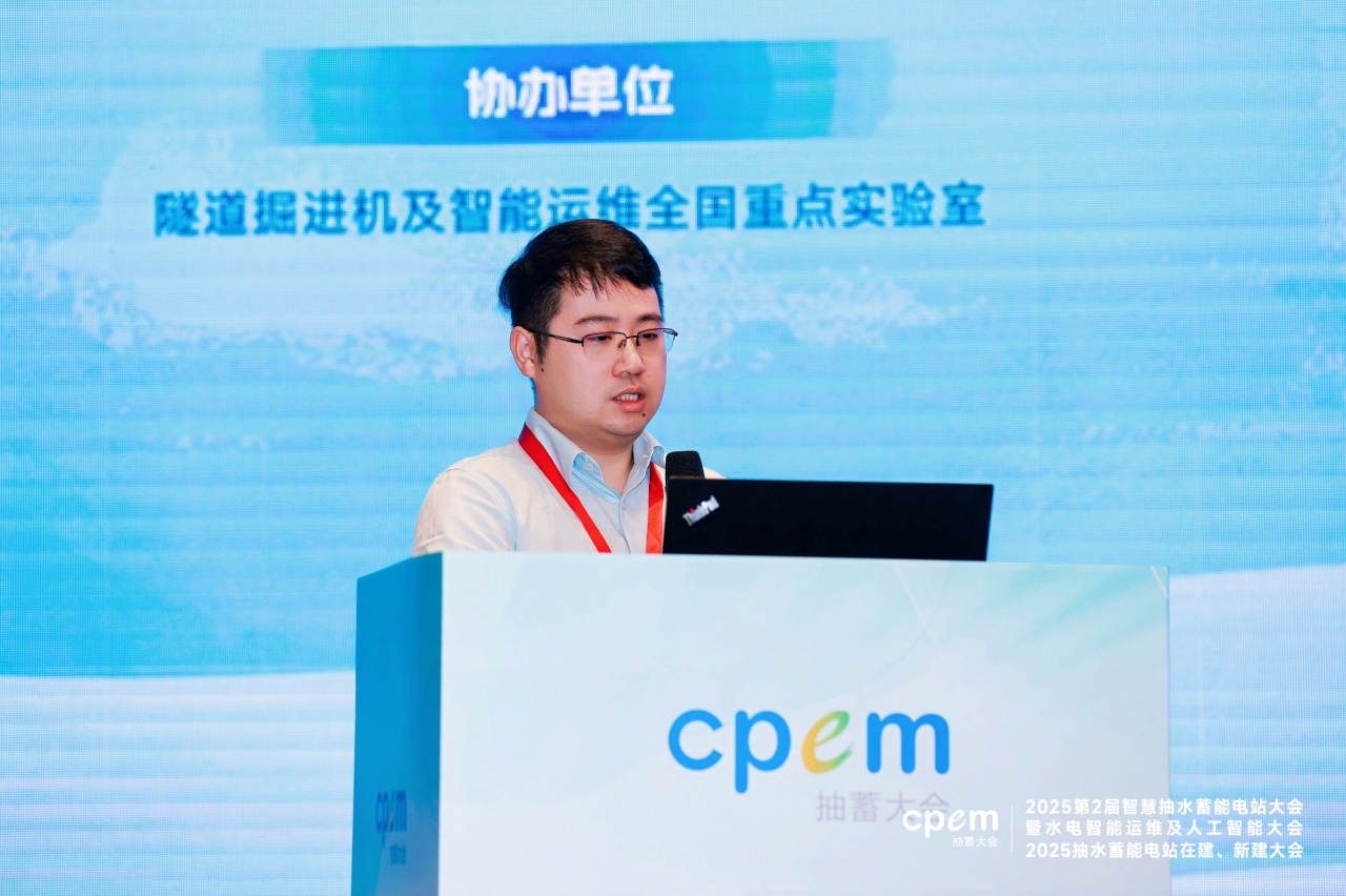 中国水利水电第六工程局有限公司科技与数字化部副主任汪云峰作《大型抽水蓄能电站上水库及引水系统智能建造关键技术研究与应用》主题分享。