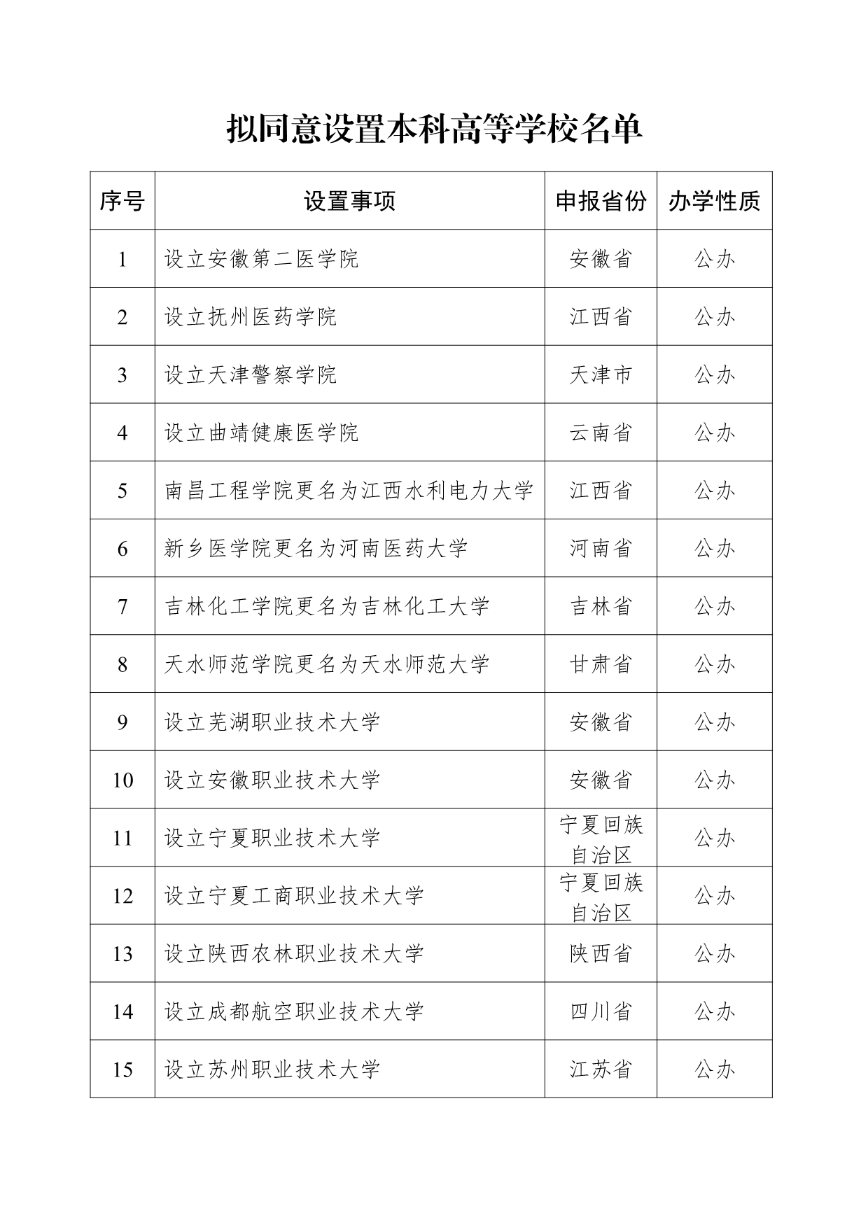 5月22日,教育部发布关于拟同意设置本科高等学校的公示。根据《中华人民共和国高等教育法》《普通高等学校设置暂行条例》《普通本科学校设置暂行规定》《本科层次职业学校设置标准(试行)》等有关规定以及第八届全国高等学校设置评议委员会考察评议结果,经教育部党组会议审议,拟同意设置安徽第二医学院等32所学校,现予公示。