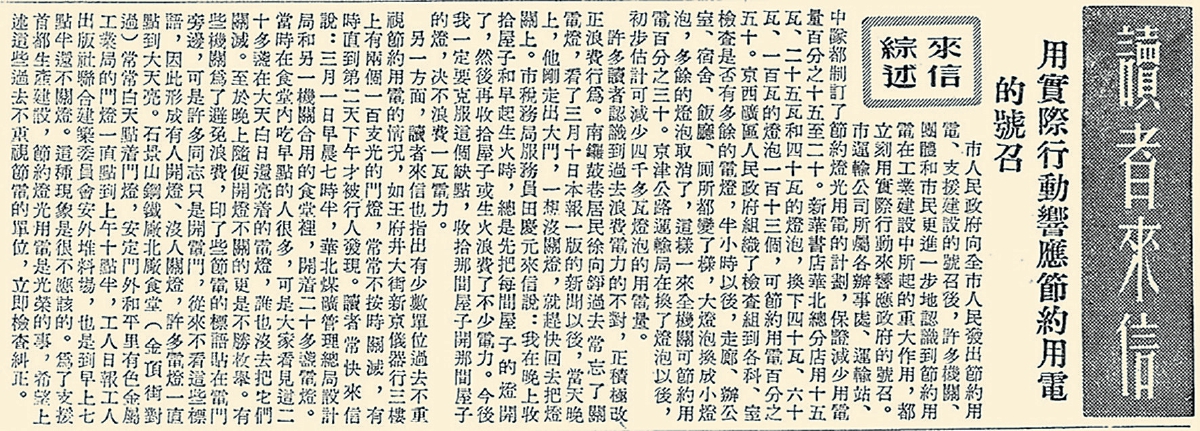 为支援首都生产建设,1954年3月,市政府召集全市各级机关、团体负责人开会,动员全市机关、工厂、学校、部队、商店和市民大力节约照明用电。号召一经发出,大家纷纷响应。据本报1954年3月17日2版《用实际行动响应节约用电的号召》报道,市运输公司所属各办事处、运输站、中队都制定了节电计划,保证减少用电量15%至20%。新华书店华北总分店用15瓦、25瓦和40瓦的灯泡,换下了40瓦、60瓦、100瓦的灯泡113个,节约用电50%。京西矿区人民政府把走廊、办公室、宿舍、饭厅和厕所的大灯泡换成小灯泡,全机关节约用电30%。