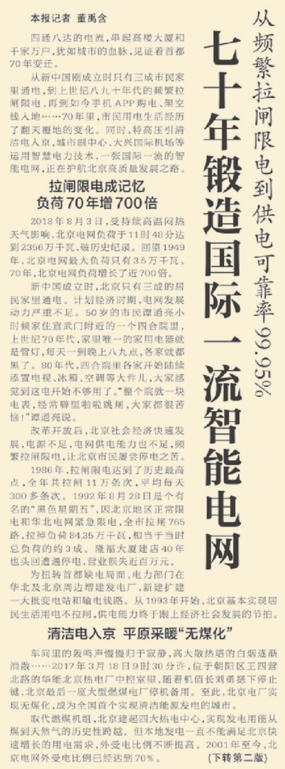 夏日炎炎,人们能坐在屋里吹电扇,或是享受空调带来的凉爽,是一件多么惬意的事!昔日,北京因严重缺电不得不频繁拉闸限电,为了支援生产建设,市政府还曾号召全市节约用电。伴随着“9511工程”“9950工程”等多项工程的完工,这种局面得以改变。如今,北京正打造国际一流的智能电网,四通八达的电流串起高楼大厦和千家万户,将为人们的生活带来更多便利。
