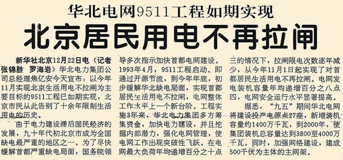 经过3年的艰苦努力,“9511工程”第一阶段目标如期实现,从1995年11月1日起,在计划用电前提下,首都居民生活用电不再拉闸。