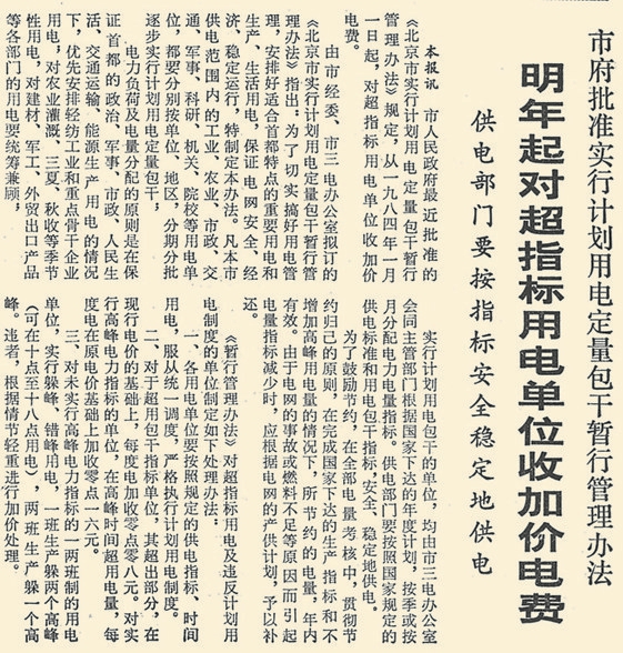 1984年,北京开始对超指标用电单位收加价电费,对于超出部分,在当时电价的基础上,每度电加收0.08元;实行高峰电力指标的单位,如在高峰时间超用电量,每度电在原电价基础上加收0.16元。(1983年10月19日《北京日报》1版,《明年起对超指标用电单位收加价电费》)1987年,节约用电的规定进一步加强,对于超计划用电的企业,要按当时电价5至10倍加价收费。