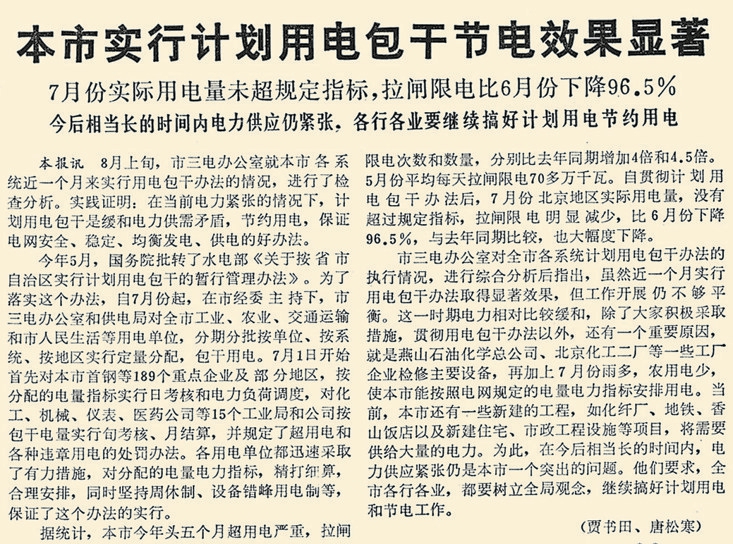 上世纪90年代,京城市政、商业、居民生活用电猛增,尤其是电扇、空调、冰箱等电器大量进入家庭,令夏季成为一个新的用电高峰。持续高温的日子,常发生设备故障和拉闸限电。