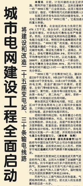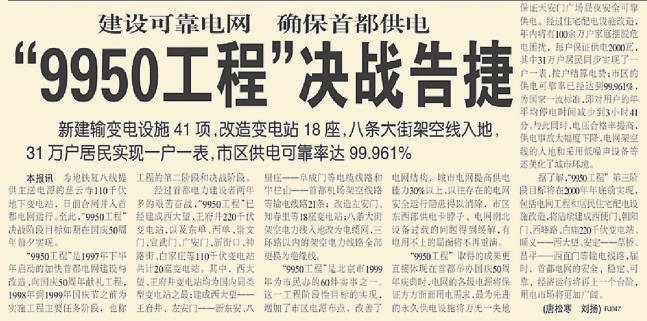 “9950工程”是以消除北京城市电网安全运行薄弱环节为目标的工程,包括新建25项输变电工程、改造已有电网。工程提出,到1999年新中国成立50周年大庆时,北京城市电网要在安全、稳定、可靠、经济运行方面跃上新台阶。(1998年6月4日《北京日报》2版,《今夏用电还会掉闸吗》)