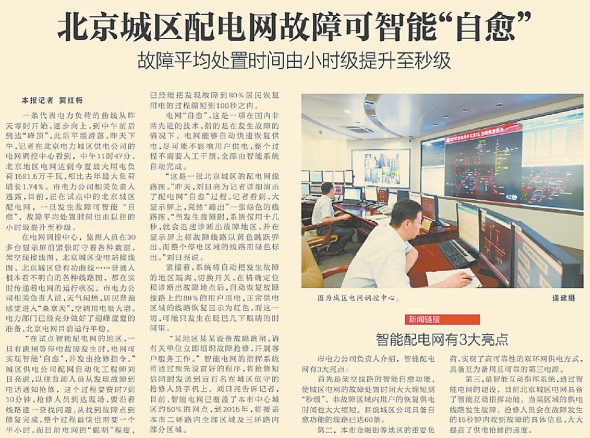 2012年,北京部分地区开始试点智能配电网,一旦有跳闸等停电故障发生时,电网可实现智能“自愈”,并发出抢修指令。过去,监测人员从发现故障到电话通知抢修要费时7到10分钟,抢修人员到达现场后还要沿着线路逐一排查,从找到故障点到修复完成,最快也得一个半小时;而智能电网已经能把发现故障到80%居民恢复用电的过程缩短到100秒之内。(2012年8月9日《北京日报》3版,《北京城区配电网故障可智能“自愈”》)