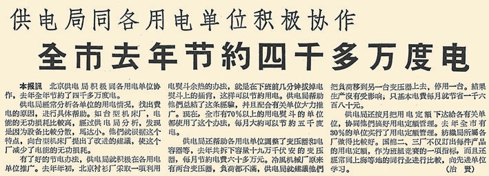 从1954年3月中旬到3月底,全市节约了80万度电。这些节约的电力用在生产上,可以炼钢1200多吨、造纸1600多吨、制面粉66.7万袋。(1954年4月13日《北京日报》1版,《本市二十天中节电八十万度》)虽然节约用电的效果明显,但部分企业在电力使用上还存在浪费现象,比如有的企业没有用电定额,设备利用率低,致使电力供应和需求不能很好地配合。为解决这个问题,国家计划委员会和电力工业部联合指示北京、天津、唐山地区从1956年1月1日起实行电力计划分配办法,以提高企业管理水平,使电力的生产和需要逐步纳入国家计划轨道。(1955年10月7日《北京日报》1版,《研究明年实行电力计划分配办法》)