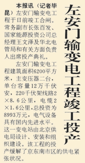 1993年12月30日,为亚洲最大住宅区——方庄配套的左安门220千伏变电站投入运行,解决了十几万人口的供电急需。
