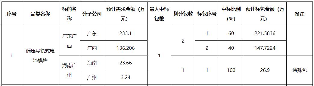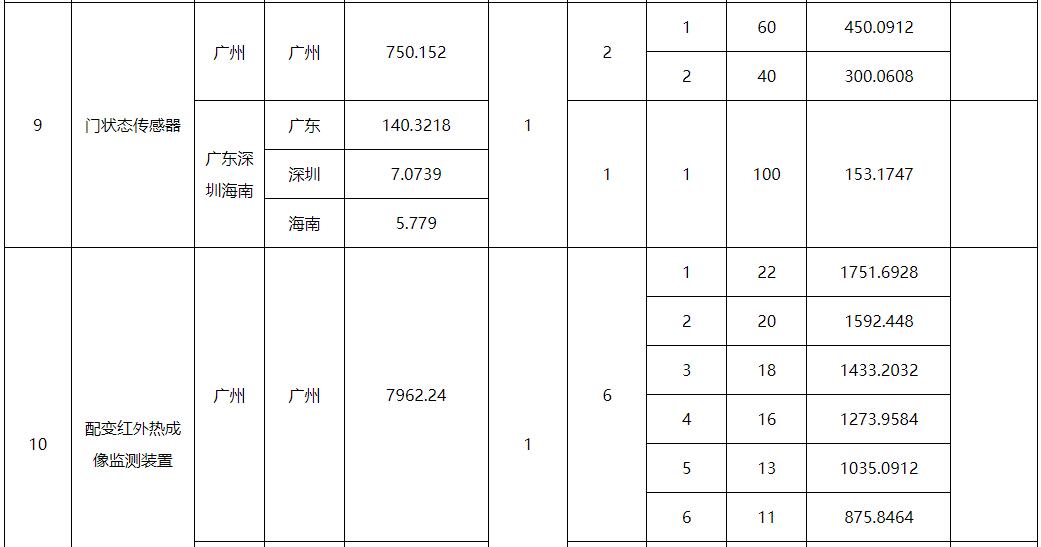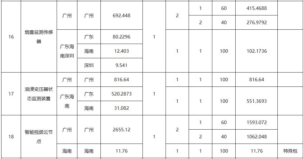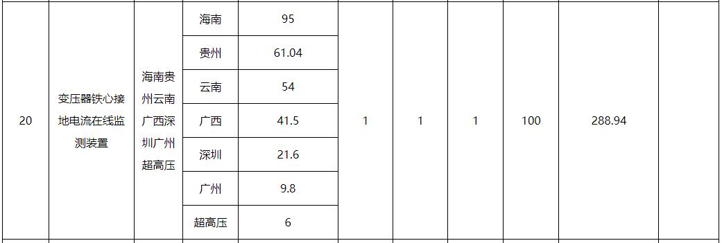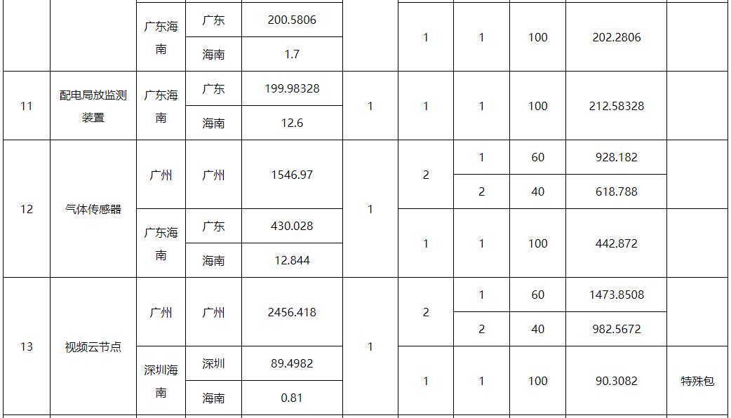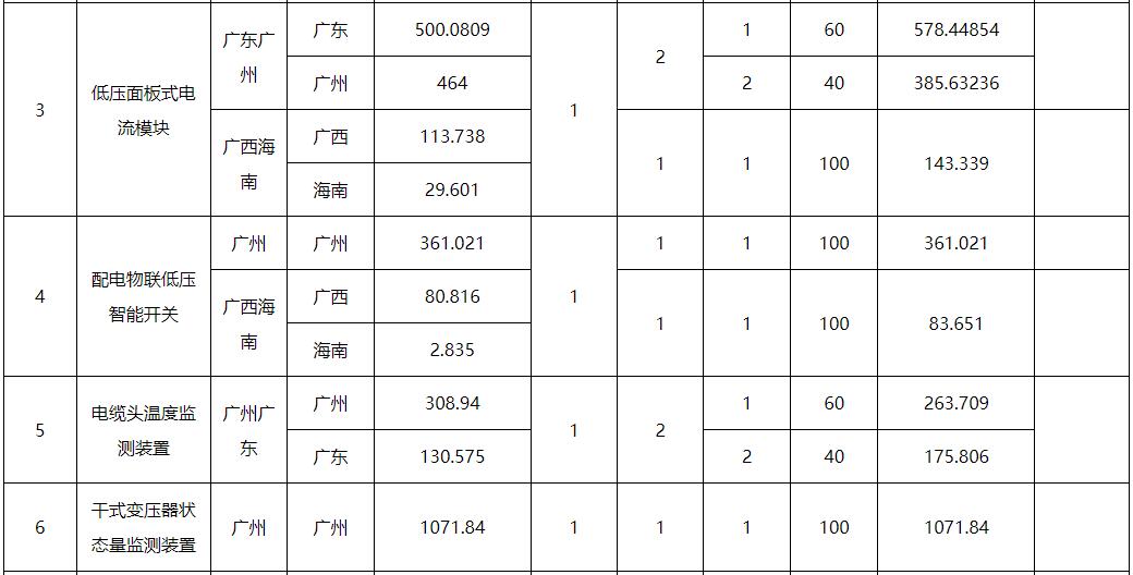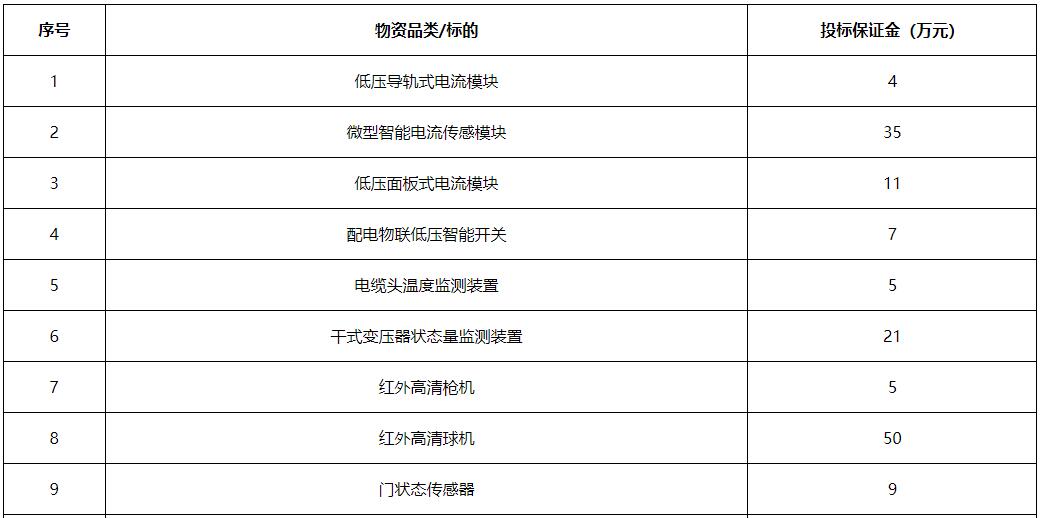 本批次框架招标范围包括数字变电站系列传感以及智能配电系列传感终端共21类物资,分别为:低压导轨式电流模块、微型智能电流传感模块、低压面板式电流模块、配电物联低压智能开关、电缆头温度监测装置、干式变压器状态量监测装置、红外高清枪机、红外高清球机、门状态传感器、配变红外热成像监测装置、配电局放监测装置、气体传感器、视频云节点、水浸传感器、温湿度传感器、烟露监测传感器、油浸变压器状态监测装置、智能视频云节点、10kV台架变综合配电箱、变压器铁心接地电流在线监测装置、色谱型变压器油中溶解气体在线监测装置。需求单位为广东、广西、云南、贵州、海南电网公司,超高压公司和深圳供电局。