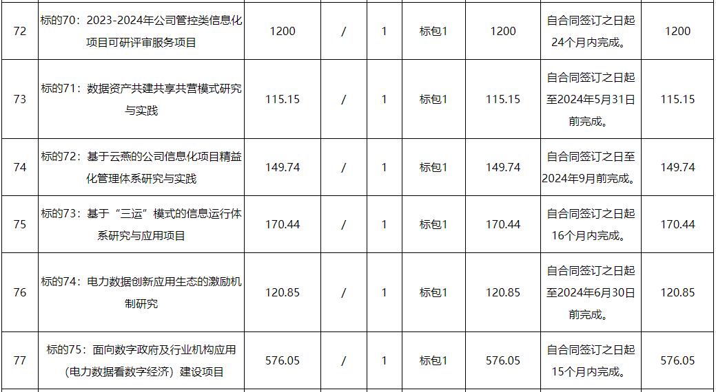 依据公司数字化部2023年信息化建设工作安排,拟开展第三批76个项目的公开招标工作,涉及系统建设类52项、研究咨询类17项、通用硬件采购类4项、技术服务类3项。