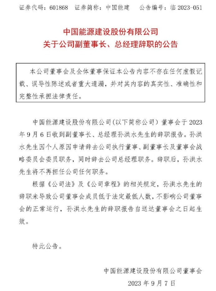 中央纪委国家监委14日通报: 中国能建党委副书记、总经理孙洪水涉嫌严重违纪违法,目前正接受中央纪委国家监委驻国务院国资委纪检监察组和江西省监委纪律审查和监察调查。 孙洪水 资料图(来源:网络) 公开资料显示,孙洪水出生于1962年1月,曾在中国水利水电第六工程局、中国水利水电建设集团、中国电力建设集团等工作,2016年任中国电力建设集团有限公司董事、党委副书记、总经理。 2020年5月,孙洪水调任中国能源建设集团有限公司党委副书记、董事、总经理。 人物履历 1999年4月任中国水利水电第六工程局副局长、总工程师。 2001年6月任中国水利水电第六工程局局长。 2004年10月任中国水利水电建设集团公司党组成员、副总经理。 2006年2月任中国水利水电建设集团公司临时党委委员、副总经理。 2007年2月任中国水利水电建设集团公司党委委员、副总经理。 2009年11月起任中国水利水电建设集团公司党委常委,房地产事业部总经理。 2011年8月任中国电力建设集团有限公司党委常委。 2012年任中国电力建设集团有限公司党委常委,中国水利水电建设股份有限公司党委副书记,总经理。 2016年9月任中国电力建设集团有限公司董事,提名为中国电力建设集团有限公司总经理人选。 2016年12月任中国电力建设集团有限公司董事,党委副书记;总经理。 2023年9月6日,中国能建公告,孙洪水辞职,将不再担任公司任何职务。 今天,中央纪委国家监委共通报5名中央企业管理人员被查的消息,除孙洪水外,其中还包含: 中国船舶集团华中光电技术研究所原党委书记、副所长赵坤涉嫌严重违纪违法,目前正接受中国船舶集团纪检监察组和湖北省孝感市监委纪律审查和监察调查。 中储粮集团财务有限公司监事会主席肖明德涉嫌严重违纪违法,目前正接受中储粮集团纪检监察组和黑龙江省监委纪律审查和监察调查。 中国石化天然气分公司原副总经理吴灿奇涉嫌严重违纪违法,目前正接受中国石化纪检监察组和辽宁省监委纪律审查和监察调查。 国家能源集团吉林电力有限公司原二级业务总监李占平涉嫌严重违纪违法,目前正接受国家能源集团纪检监察组和贵州省铜仁市监委纪律审查和监察调查。 二级业务总监相当于厅局级副职。