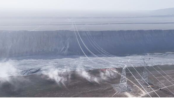 4月8日,凤凰—乌苏II回750千伏输变电工程跨越独山子大峡谷。(马元 摄)