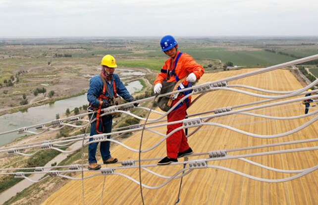 同时,工程线路还跨越兰新铁路、连霍高速及312国道。考虑到被跨越的重要交通枢纽往来车辆频繁,为不影响交通运输,工程采用搭设钢管桥、附加横担、对地封网等方式开展跨越施工,同时增加高空施工作业力量,对跨越点进行24小时不间断守护,并投入实时图像和数据接收、监测的智能牵张设备提高施工效率、降低安全风险,保证跨越施工顺利进行。