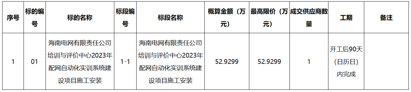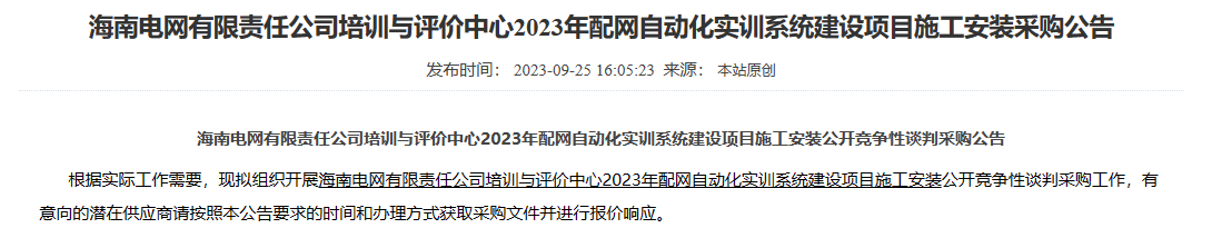 根据实际工作需要,现拟组织开展海南电网有限责任公司培训与评价中心2023年配网自动化实训系统建设项目施工安装公开竞争性谈判采购工作,有意向的潜在供应商请按照本公告要求的时间和办理方式获取采购文件并进行报价响应。