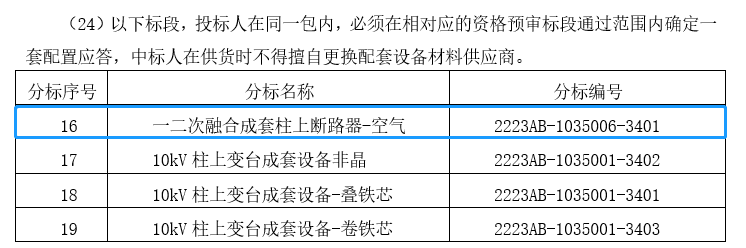 “一二次融合成套柱上断路器-空气”标段,投标人在同一包内,必须在相对应的资格预审标段通过范围内确定一套配置应答,中标人在供货时不得擅自更换配套设备材料供应商。