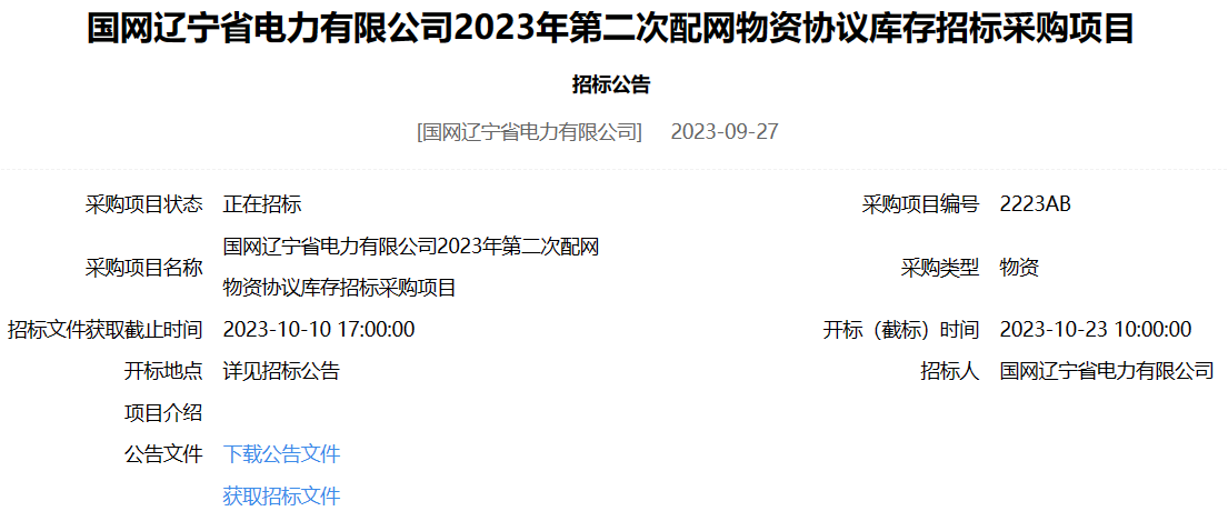 9月27日,国网辽宁省电力有限公司发布“2023年第二次配网物资协议库存公开招标采购项目”的招标公告。