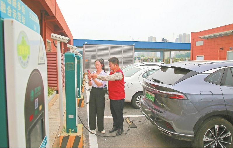 供电员工在滨湖智能能源服务站内帮助新能源汽车车主充电。