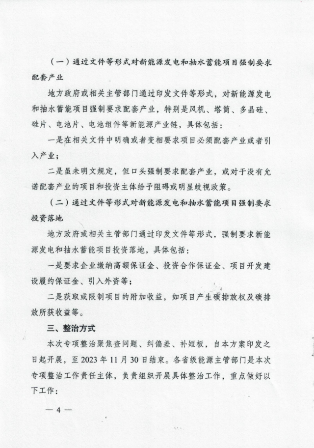 《通知》还指出,聚焦2023年1月1日以来各地方组织实施的风电、光伏和抽水 蓄能开发项目,核查项目在签订开发意向协议、编制项目投资市场 化配置方案、组织实施市场化配置项目开发过程、项目开发建设全过程中是否存在不当市场干预行为,重点整治以下问题: