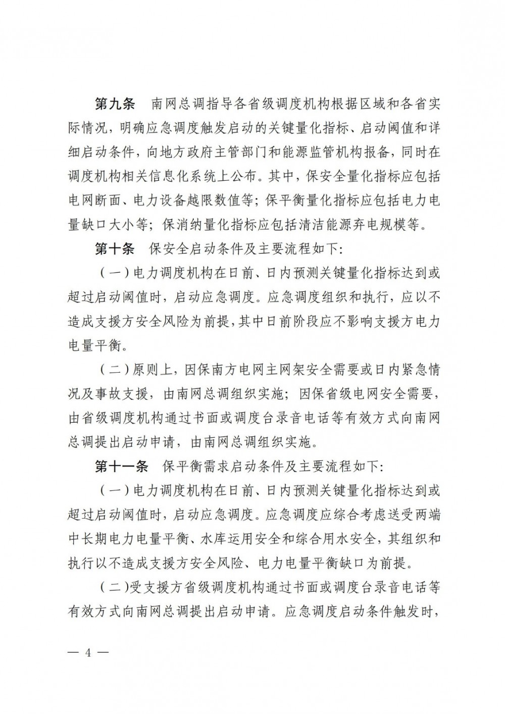 电力调度机构在日前、日内预测关键量化指标达到或超过启动阈值时,启动应急调度。应急调度组织和执行以不造成支援方安全风险、电力电量平衡缺口、不增加支援方清洁能源消纳弃电量为前提。