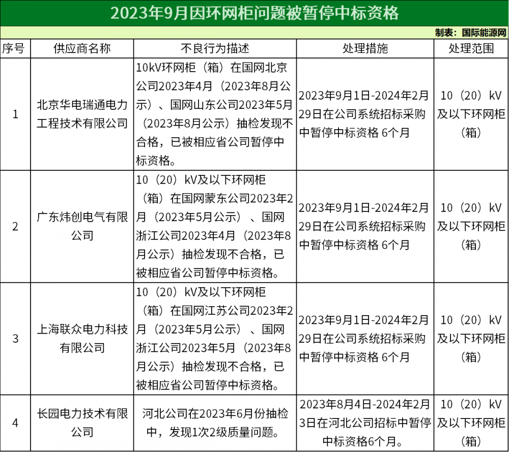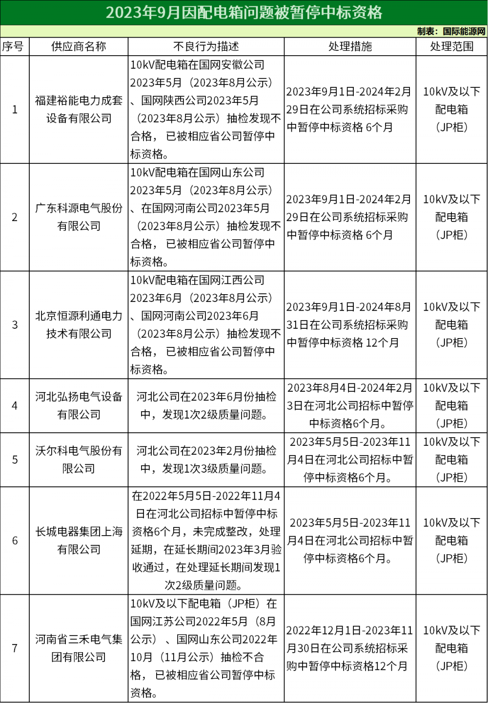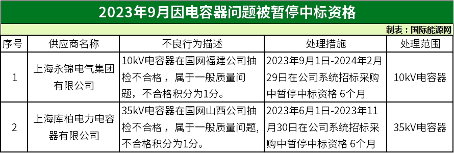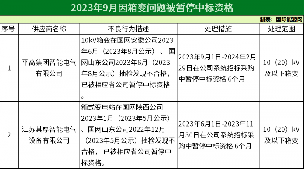 平高集团智能电气有限公司:10kV箱变在国网安徽公司2023年6月(2023年8月公示)、国网山东公司2023年6月(2023年8月公示)抽检发现不合格,已被相应省公司暂停中标资格,被暂停中标资格 6个月;