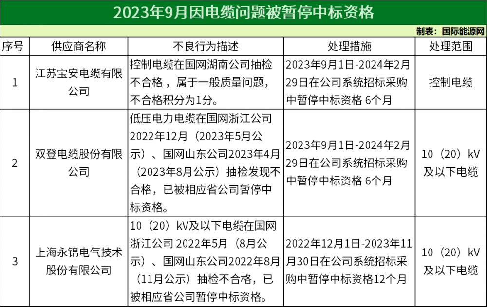江苏宝安电缆有限公司:控制电缆在国网湖南公司抽检不合格,属于一般质量问题,不合格积分为1分,被暂停中标资格 6个月;