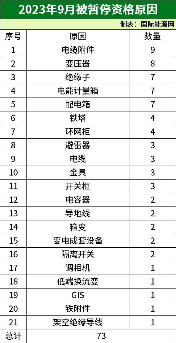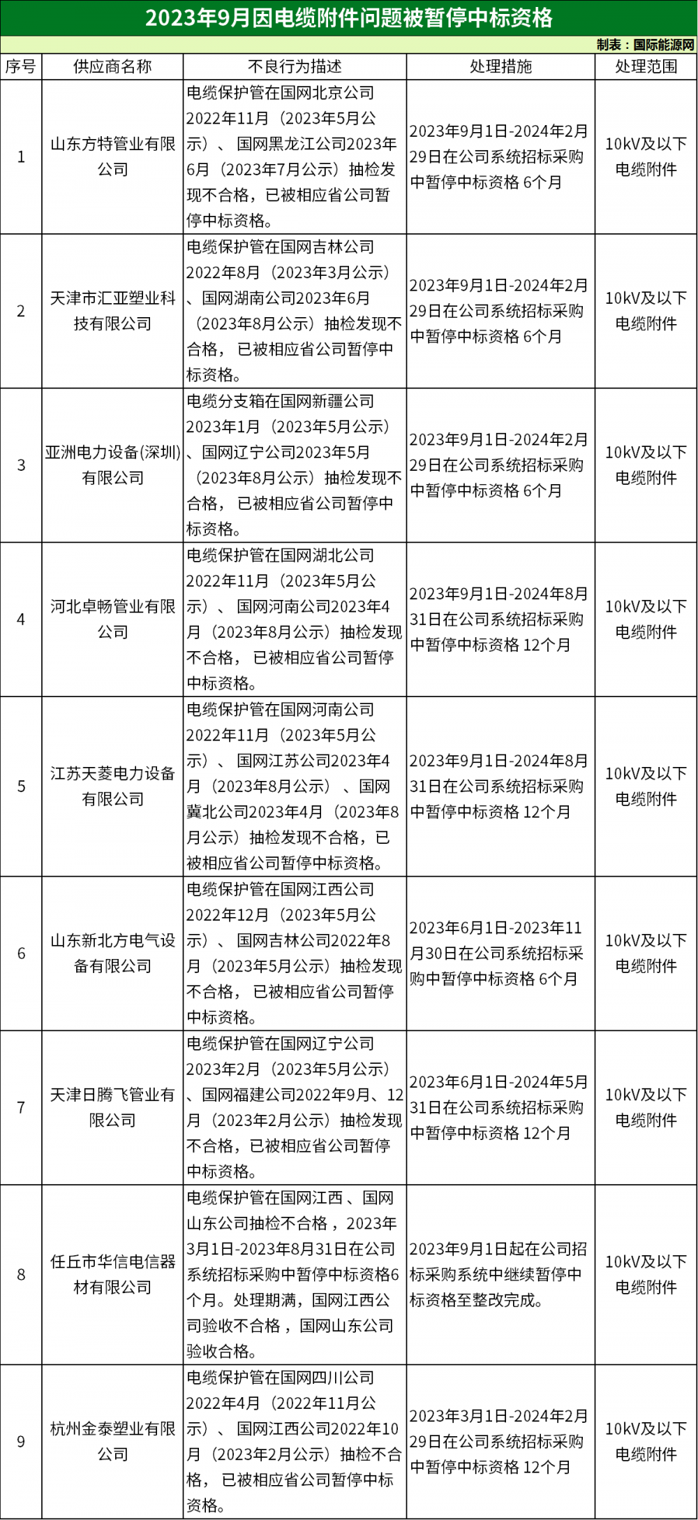 总体来看,被拉黑的企业以设备之外的服务供应商为主体,而被暂停中标资格的则全部是设备供应商。8月问题最多的电缆附件在9月依旧是问题重灾区。