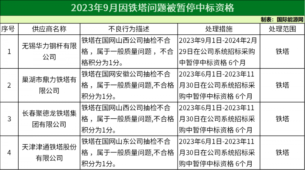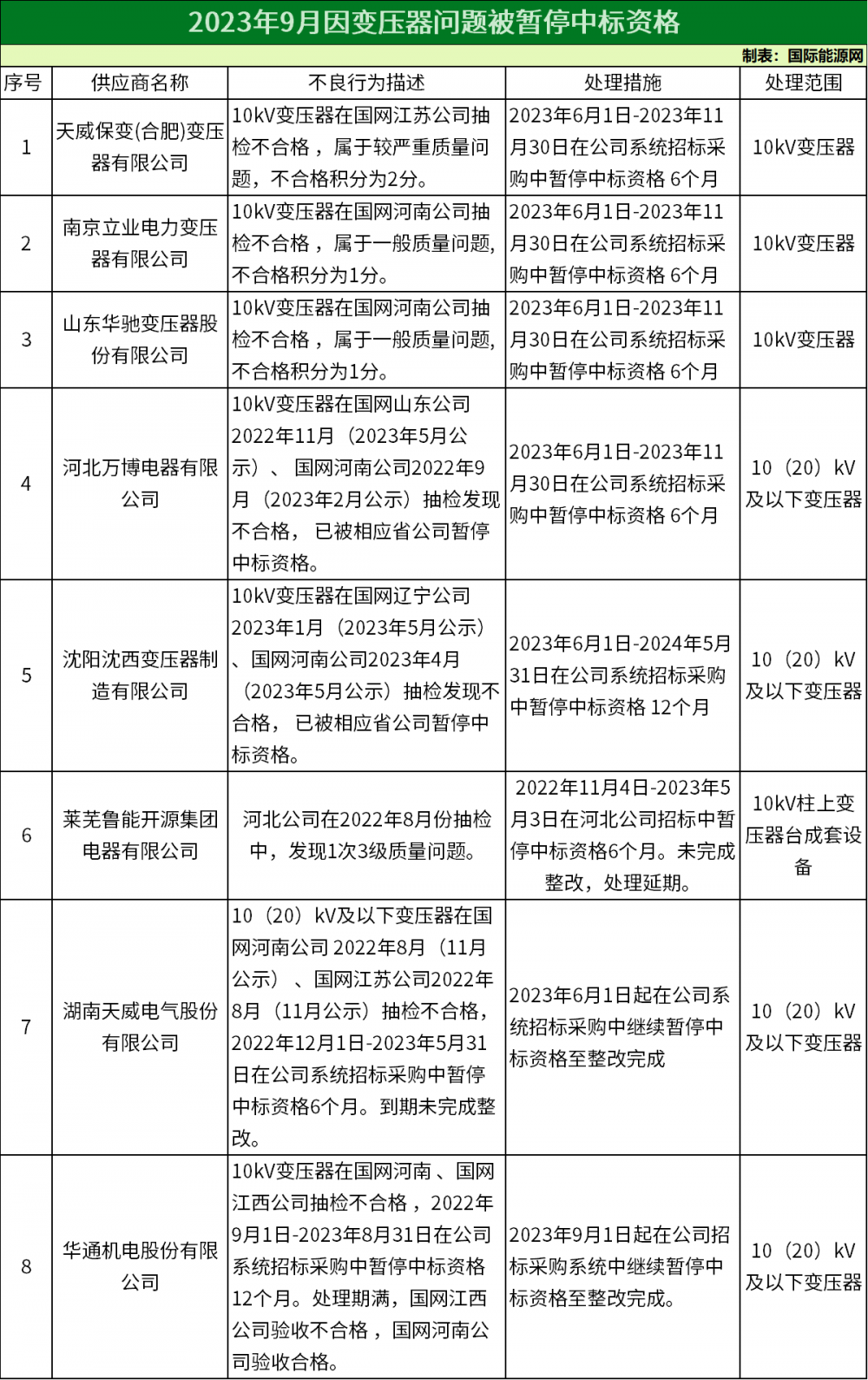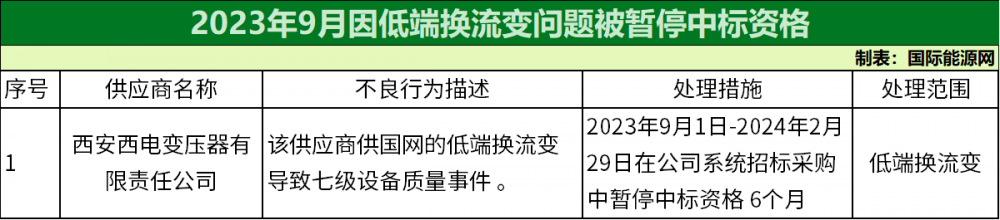 西安西电变压器有限责任公司:该供应商供国网的低端换流变导致七级设备质量事件,被暂停中标资格 6个月。