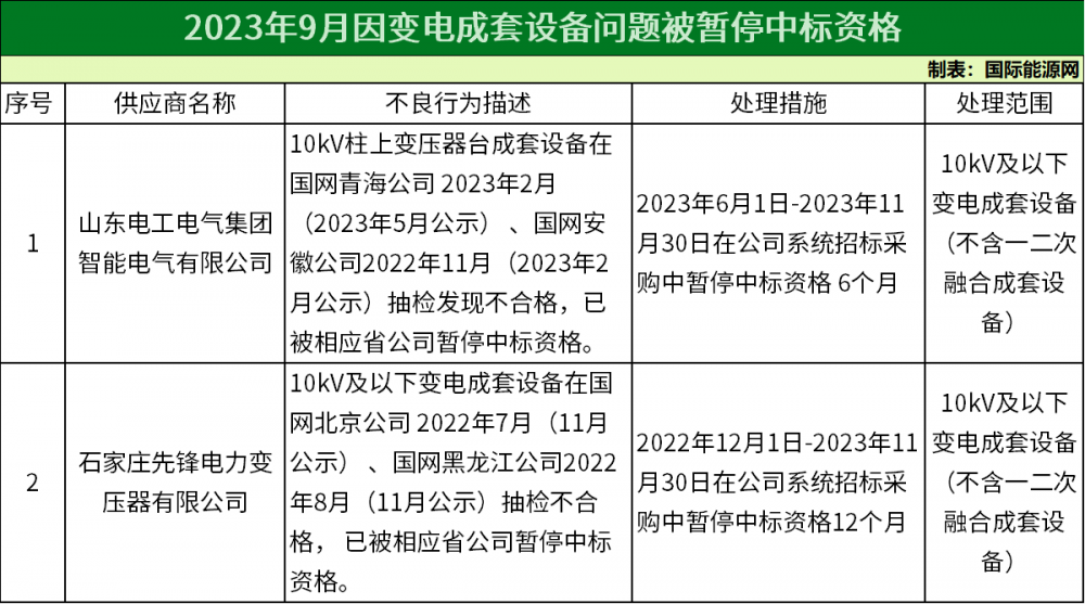 山东电工电气集团智能电气有限公司:10kV柱上变压器台成套设备在国网青海公司 2023年2月(2023年5月公示)、国网安徽公司2022年11月(2023年2月公示)抽检发现不合格,被暂停中标资格 6个月。