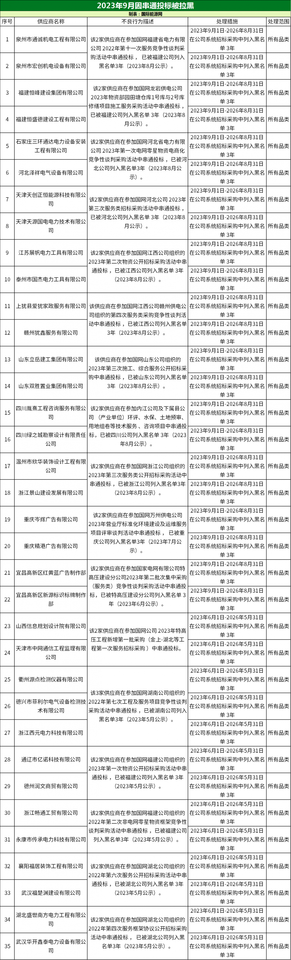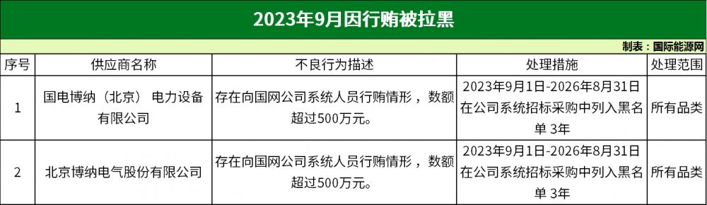 因行贿而被拉黑的企业分别为国电博纳(北京)电力设备有限公司和北京博纳电气股份有限公司。因存在向国网公司系统人员行贿情形,数额超过500万元,处理措施都为2023年9月1日-2026年8月31日在公司系统招标采购中列入黑名单3年。