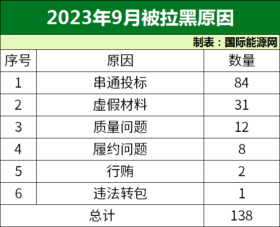 诚信问题在招标活动中是老生常谈的问题,但是每次依旧是拉黑首要原因,在9月,共有84家企业发生串通投标情形,31家企业出现了提供虚假信息和材料问题。