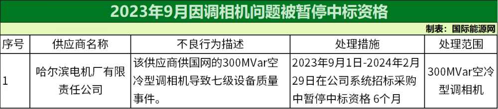 哈尔滨电机厂有限责任公司:该供应商供国网的300MVar空冷型调相机导致七级设备质量事件,被暂停中标资格 6个月;