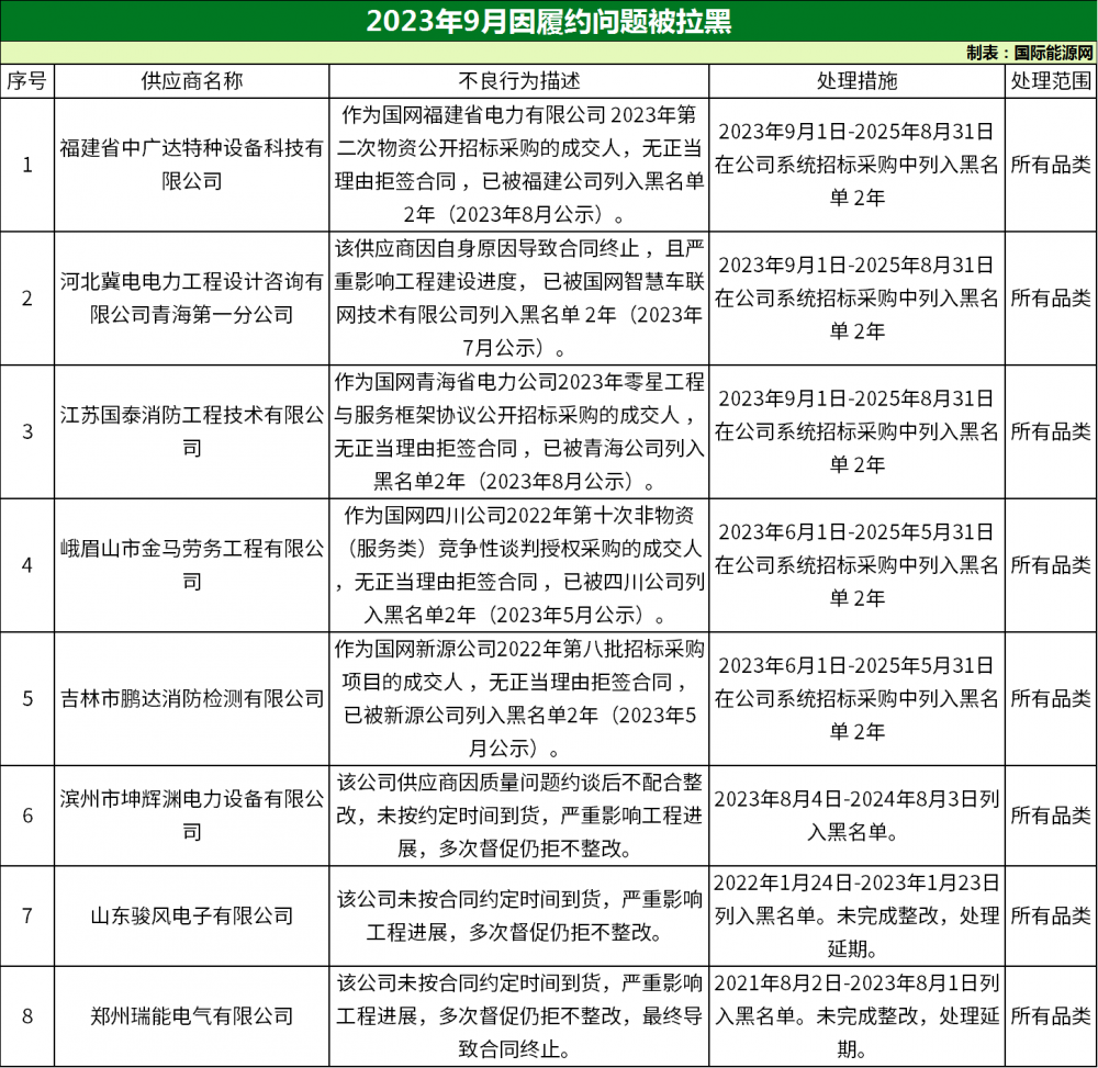 另有8家也因为履约问题而被拉黑,分别涉及福建省中广达特种设备科技有限公司、河北冀电电力工程设计咨询有限公司青海第一分公司、江苏国泰消防工程技术有限公司、峨眉山市金马劳务工程有限公司、吉林市鹏达消防检测有限公司、滨州市坤辉渊电力设备有限公司、山东骏风电子有限公司、郑州瑞能电气有限公司。拉黑原因包括拒签合同、交付不及时影响工程进度等。