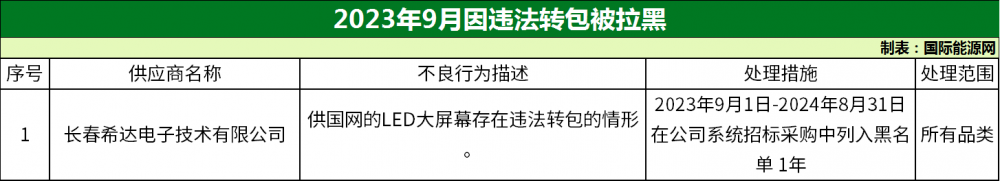 9月国网黑名单中,因串通投标和弄虚作假依旧是老生常谈的问题。其中串通投标问题涉及84家企业,另外还出现了一家违法转包的企业:长春希达电子技术有限公司,因为供国网的LED大屏幕存在违法转包的情形,而被国网拉黑,时间期限从2023年9月1日-2024年8月31日,并且是全品类拉黑。