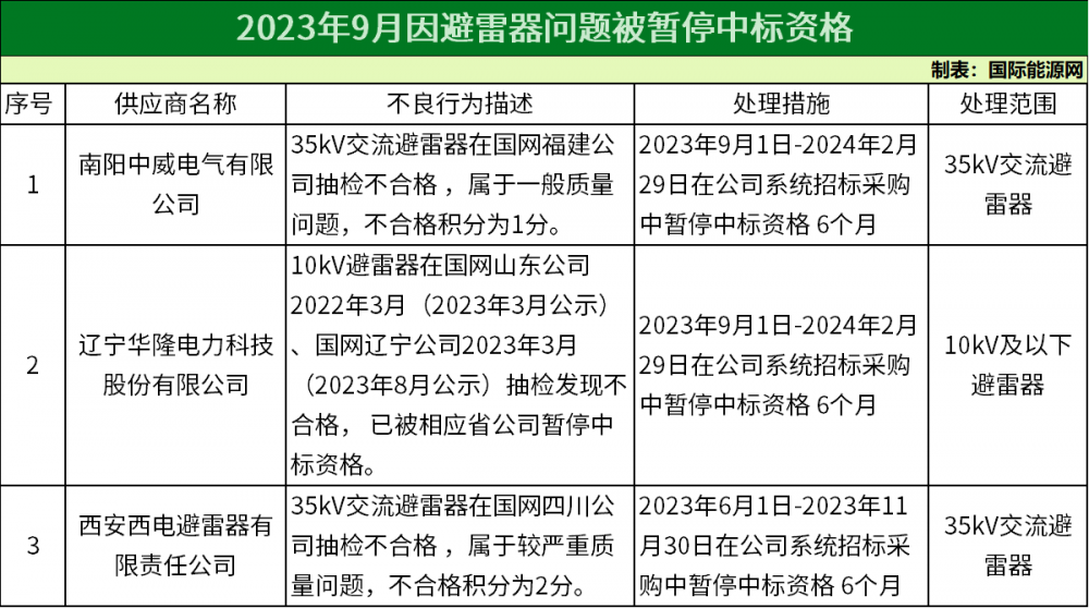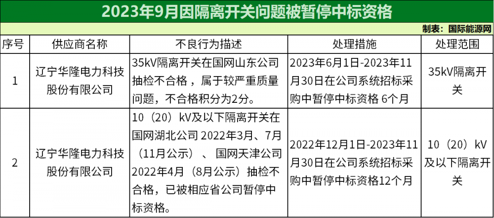 辽宁华隆电力科技股份有限公司:10kV避雷器在国网山东公司2022年3月(2023年3月公示)、国网辽宁公司2023年3月(2023年8月公示)抽检发现不合格,被暂停中标资格 6个月;